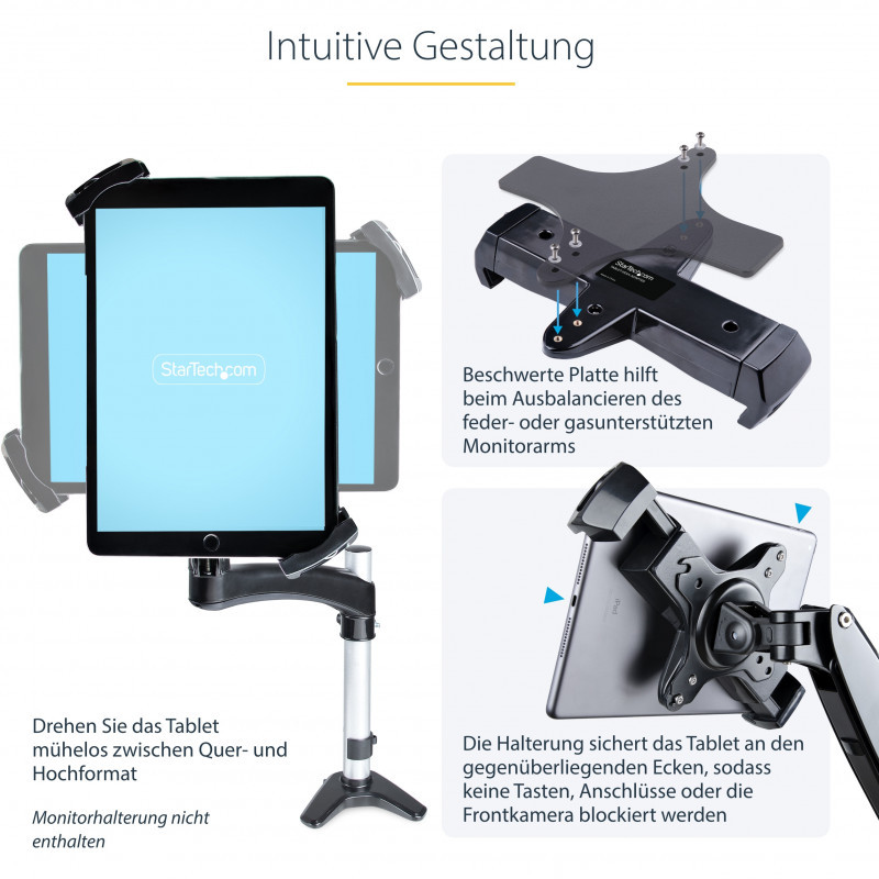 The clever design does not block the ports, front-facing camera, or buttons, allowing users to use all the tablet's features (remove any protective cases from the tablet). The 0.7 lb (0.35 kg) weighted plate can be added to the tablet mount, to ensure optimal operation of spring-assisted/one-touch monitor arms.