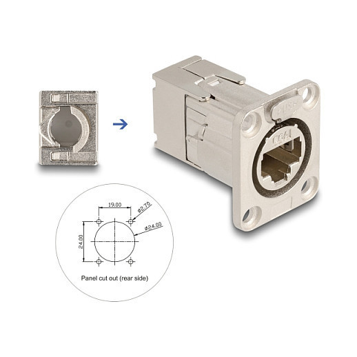 "DeLOCK D-Type RJ45 built-in connector with LSA connection Cat.6A STP metal. Connector(s): RJ45, Product colour: Silver, Connector gender: Female. Width: 32.6 mm, Depth: 43.1 mm, Height: 27.6 mm. Quantity per pack: 1 pc(s), Package type: Polybag"\n"This RJ45 built-in conenctor with D-shaped metal flange by Delock can be used for panel mounting and for installation in a housing.