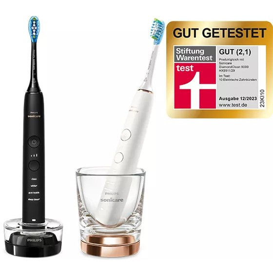"Philips Sonicare DiamondClean 9000 DiamondClean 9000 HX9914/57 2-pack sonic electric toothbrush with charger & app. Purpose: Adult, Toothbrush type: Sonic toothbrush, Teeth brushing modes: Daily care, Deep clean, Gum care, Whitening. Power source: AC/Battery, Battery type: Built-in battery, Battery technology: Lithium-Ion (Li-Ion). Number of handles included: 2 pc(s), Number of brush heads included: 2 pc(s)"\n"Whiter teeth in just 1 day*