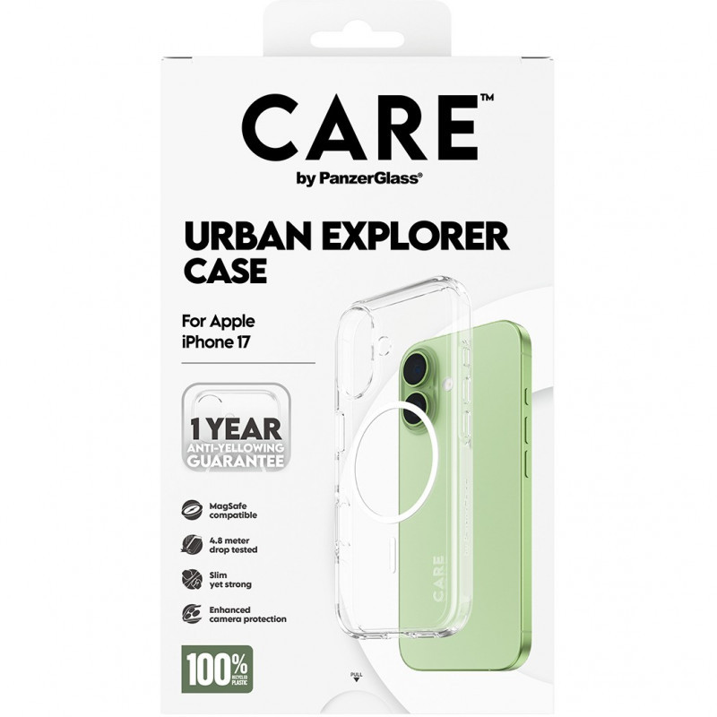 "PanzerGlass CARE by ® Flagship Case Transparent Urban Explorer w. White MagSafe iPhone 17. Case type: Cover, Brand compatibility: Apple, Compatibility: Apple - iPhone 17, Surface coloration: Monochromatic, Product colour: Transparent"\n"Our top pick. Call sign bombshell. Phenomenal protection designed for urban exploration and adventure. Every angle and corner has been drop tested at 4.8 meters. The Urban Explorer case, made from recycled plastic, is designed for wireless charging and MagSafe compatibility. And it comes with our 1 Year Anti-Yellowing guarantee – no questions asked.