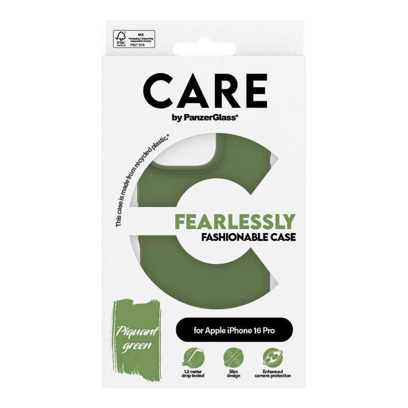 "PanzerGlass CARE™ by ® Case Green iPhone 16 Pro. Case type: Cover, Brand compatibility: Apple, Compatibility: Apple - iPhone 16 Pro, Product colour: Green"\n"Fearlessly Fashionable, BABY!