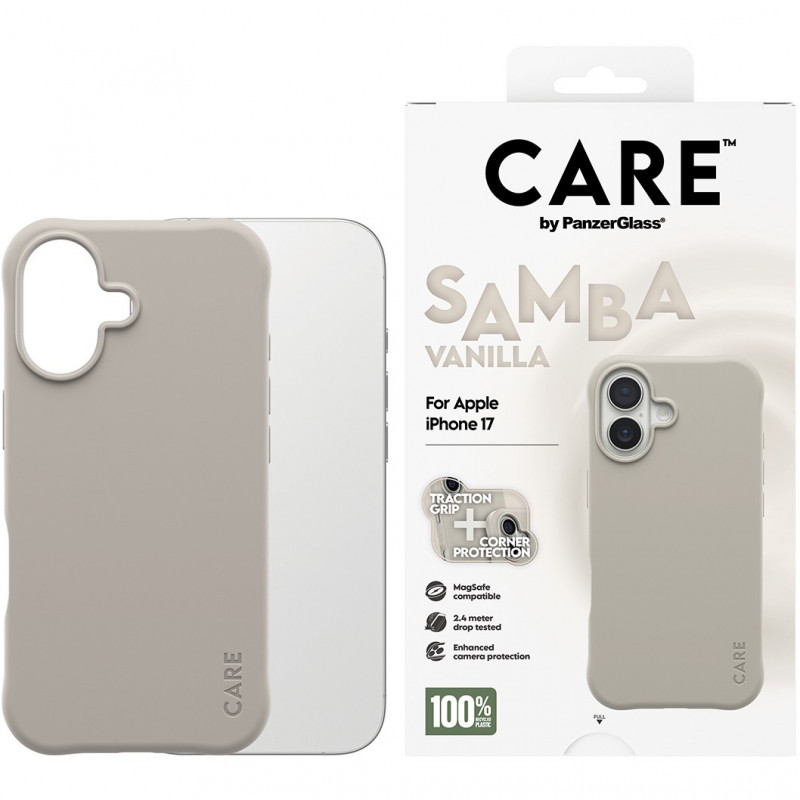 "PanzerGlass CARE by ® Fashionable Case Samba Vanilla w. MagSafe iPhone 17. Case type: Cover, Brand compatibility: Apple, Compatibility: Apple - iPhone 17, Surface coloration: Monochromatic, Product colour: Beige"\n"Protect Your Tech in Style