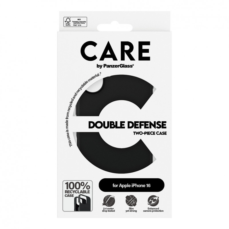 "PanzerGlass CARE™ by ® Double Defense Case Black iPhone 16. Case type: Cover, Brand compatibility: Apple, Compatibility: Apple - iPhone 16, Product colour: Black"\n"Double the defense, double the fun. This is the world’s first 100% recycled and recyclable phone case with high impact protection. Every angle and corner has been drop-tested at 2.4 meters. It’s light-weight two-piece construction offers a secure grip. The slim, stylish profile slides in and out of pockets with ease. This case also comes with wireless charging.