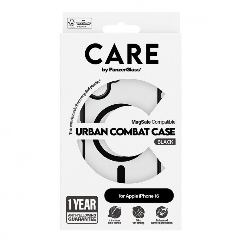 "PanzerGlass CARE™ by ® Urban Combat Case Transparent w. Black Frame & MagSafe iPhone 16. Case type: Cover, Brand compatibility: Apple, Compatibility: Apple - iPhone 16, Product colour: Black"\n"Our top pick. Call sign bombshell. Phenomenal protection designed for urban exploration and adventure. Every angle and corner has been drop tested at 4.8 meters. The Urban Combat case, made from recycled plastic, is designed for wireless charging and MagSafe compatibility. And it comes with our 1 Year Anti-Yellowing guarantee – no questions asked.