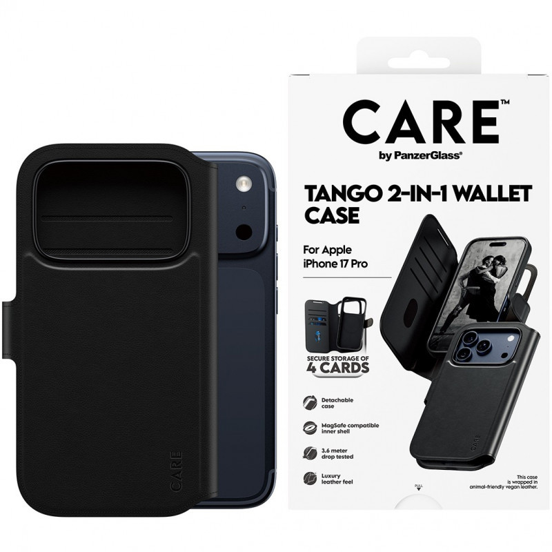 "PanzerGlass CARE by ® Feature Case Tango Two-in-One Wallet w. MagSafe iPhone 17 Pro. Case type: Cover, Brand compatibility: Apple, Compatibility: Apple - iPhone 17 Pro, Product colour: Black"\n"Tango Two-in-One Wallet Case It takes two to tango. This slim yet durable wallet-and-case-in-one has a luxurious leather-like feel. It’s a stylish combination of protection and convenience at your fingertips. More than just an accessory, this chic casual wallet features an easy open-and-close clasp and a detachable phone case wrapped in animal-friendly vegan leather, providing secure storage of up to four cards, including RFID blocking. And because it’s MagSafe and Qi compatible, you can enjoy seamless wireless charging without removing the case.