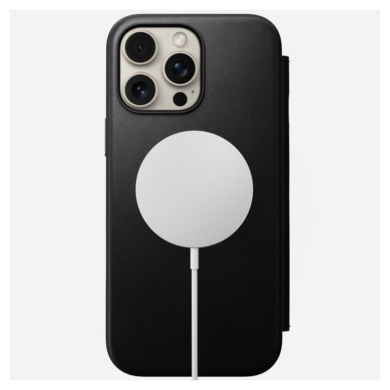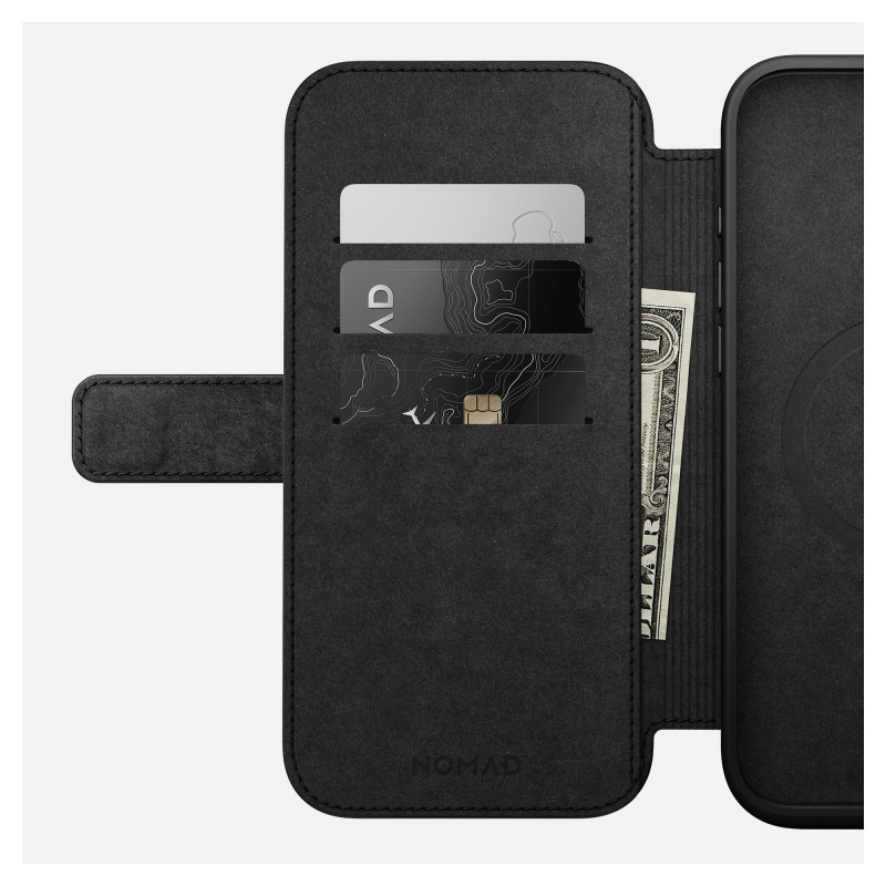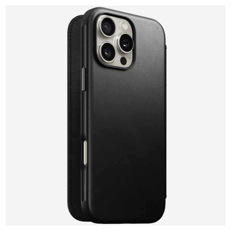"Nomad NM01675785. Case type: Folio, Brand compatibility: Apple, Maximum screen size: 17.5 cm (6.9""), Surface coloration: Monochromatic, Product colour: Black, Desktop stand, Number of card pockets: 3"\n"Modern Leather Folio stylishly elevates the look and feel of your iPhone 16 Pro Max while protecting your device and storing your cash and cards. Built with full-grain, sustainably sourced leather, it will patina with time to develop a finish unique to you.