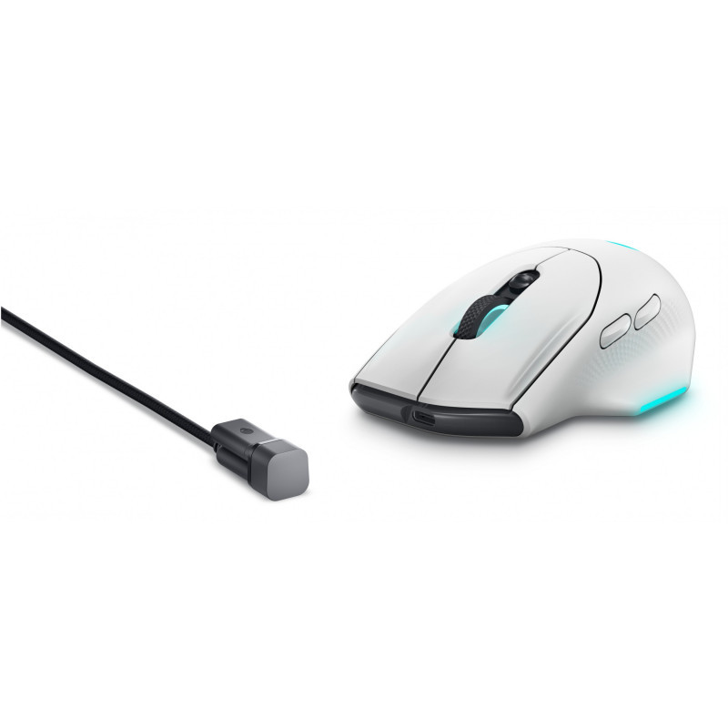 "Alienware AW620M. Form factor: Right-hand. Movement detection technology: Optical, Device interface: RF Wireless + USB Type-C, Movement resolution: 26000 DPI, Buttons quantity: 7, Scroll type: Wheel, Acceleration (max): 50 G. Illumination colour: Multi. Power source: Batteries/Cable. Product colour: White"\n"Conquer gaming marathons with a wireless mouse that’s crafted with 26,000 DPI, reliable connectivity, robust battery life, and a right-hand-focused shape."