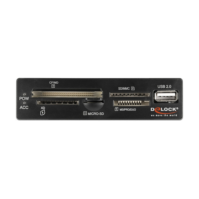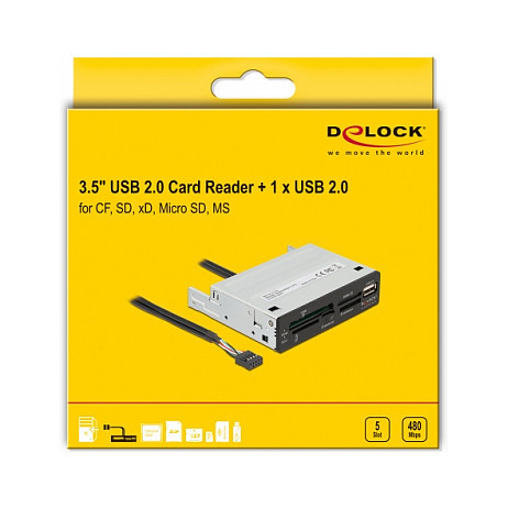 "DeLOCK 3.5″ USB 2.0 Card Reader 5 slot + 1 x USB 2.0 Type-A female. Compatible memory cards: CF, CF Type II, MMC, MMC Mobile, MMC+, MMCmicro, MS PRO, MicroSD (TransFlash), MicroSDHC, SD, xD, Product colour: Black, Grey, Supported drive bays: 3.5"". Interface: USB 2.0. Quantity per pack: 1 pc(s), Package type: Box. Compatible operating systems: Linux Kernel 5.11 or above Windows 8.1/8.1-64/10/10-64/11 PC with one free 3.5″ bay Motherboard..."\n"This card reader by Delock can be installed into a 3.5″ bay of a PC and will be connected to an internal USB 2.0 pin header male port. It has a five slotcard reader and enables the connection of one USB device."