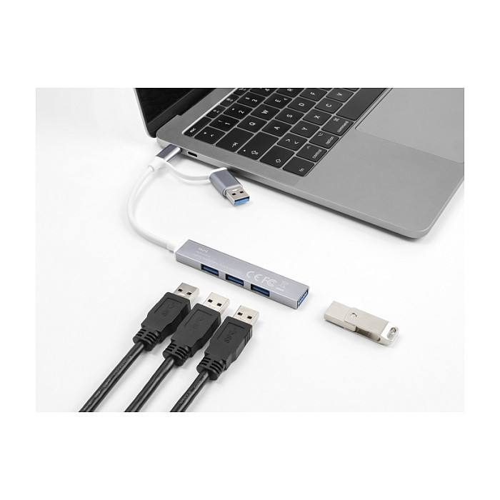 "DeLOCK 4 Port Slim USB Hub with USB Type-C or USB Type-A to 3 x USB 2.0 Type-A female + 1 x USB 5 Gbps Type-A female. Host interface: USB 3.2 Gen 1 (3.1 Gen 1) Type-A + Type-C, Hub interfaces: USB 2.0, USB 3.2 Gen 1 (3.1 Gen 1) Type-A. Data transfer rate: 5000 Mbit/s, Product colour: Silver, Housing material: Metal. Power supply type: USB. Other operating systems supported: ChromeOS. Width: 86 mm, Depth: 11 mm, Height: 7 mm"\n"This solid USB hub by Delock with metal housing can be connected to a computer, laptop or mobile device via the USB Type-A or USB-C™ interface. It expands the computer by 4 USB Type-A ports. Different USB devices such as USB flash memory, card reader, external enclosure etc. can be connected.