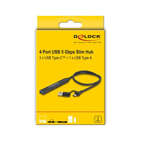 "DeLOCK 4 Port Slim USB Hub with USB Type-C™ or USB Type-A to 3 x USB 5 Gbps USB Type-C™ + 1 x USB 5 Gbps Type-A. Host interface: USB 3.2 Gen 1 (3.1 Gen 1) Type-C, Hub interfaces: USB Type-C. Data transfer rate: 5000 Mbit/s, Product colour: Black, Housing material: Metal. Windows operating systems supported: Windows 10, Windows 10 x64, Windows 11, Mac operating systems supported: Mac OS 13.1, Linux operating systems supported: Linux Kernel 5.15. Width: 17 mm, Depth: 104 mm, Height: 7 mm. Quantity per pack: 1 pc(s), Package type: Hanging box"\n"Description