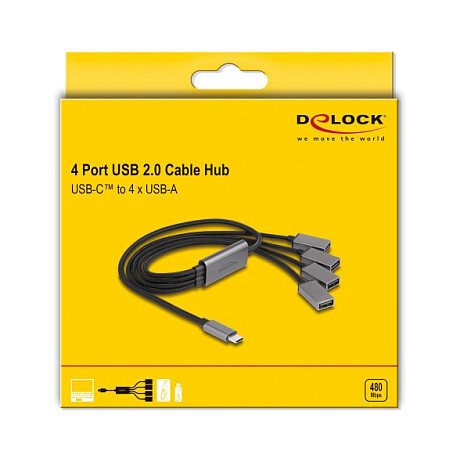 "DeLOCK 4 Port USB 2.0 Cable Hub with USB Type-C connector 60 cm. Host interface: USB 2.0 Type-C, Hub interfaces: USB 2.0. Data transfer rate: 480 Mbit/s, Product colour: Black, Grey, Housing material: Metal. Power supply type: USB, Input current: 1.5 A. Windows operating systems supported: Windows 10, Windows 10 x64, Windows 11, Other operating systems supported: Android, ChromeOS. Quantity per pack: 1 pc(s), Package type: Box"\n"This USB hub by Delock can be connected to a computer, laptop or mobile device via the USB-C™ interface. It expands the computer by 4 USB Type-A ports. Different USB devices such as USB flash memory, card reader, external enclosure etc. can be connected.