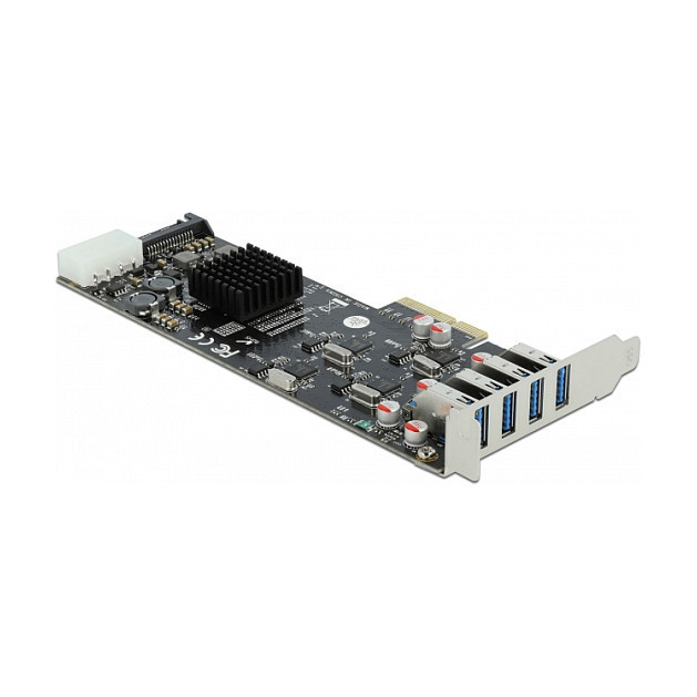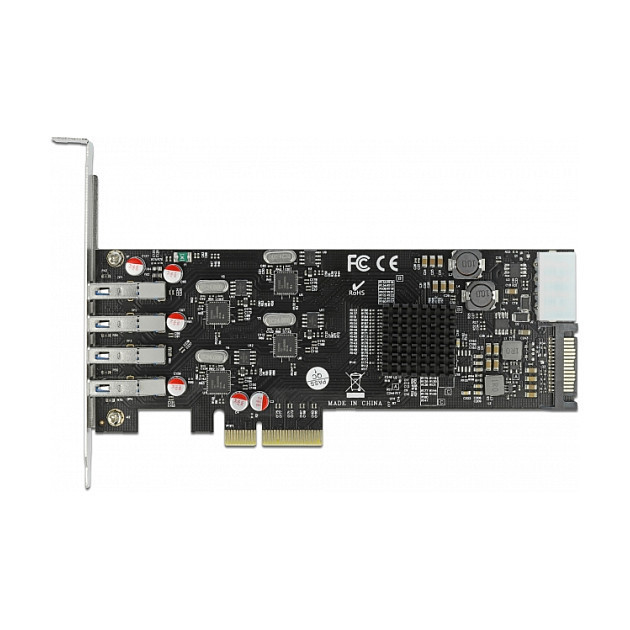 "DeLOCK PCI Express x4 Card to 4 x external SuperSpeed USB (USB 3.2 Gen 1) USB Type-A female Quad Channel - Low Profile Form Factor. Host interface: PCIe, Output interface: PCIe, SATA, USB 3.2 Gen 1 (3.1 Gen 1), Expansion card form factor: Low-profile. Product colour: Grey, Purpose: PC. Data transfer rate (max): 5 Gbit/s. Windows operating systems supported: Windows 10, Windows 10 x64, Windows 8.1, Windows 8.1 x64, Linux operating systems supported: Kernel 3.3. Package type: Box"\n"Description