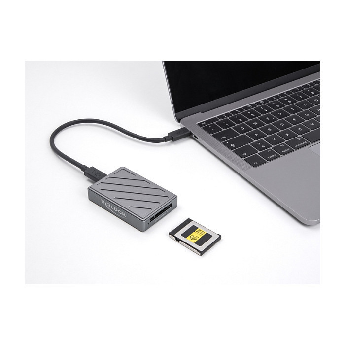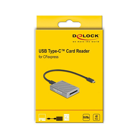"DeLOCK 40 Gbps USB Type-C Card Reader for CFexpress type B memory cards. Compatible memory cards: CFexpress 2.0 Type B, Product colour: Grey, Data transfer rate: 40000 Mbit/s. Interface: USB4 Gen 3x2 Type-C. Width: 50 mm, Depth: 75 mm, Height: 14 mm. Quantity per pack: 1 pc(s), Package type: Hanging box. Cables included: USB Type-C to USB Type-C"\n"The card reader by Delock can be used for reading and writing CFexpress memory cards. The card reader can be connected to a PC or a mobile device via the USB interface. Thanks to the support of a maximum data transfer rate of up to 40 Gbps, even large amounts of data - such as 8K video recordings or RAW image series - can be transferred extremely quickly. The card reader is therefore ideal for professional users in the photo and video sector.
