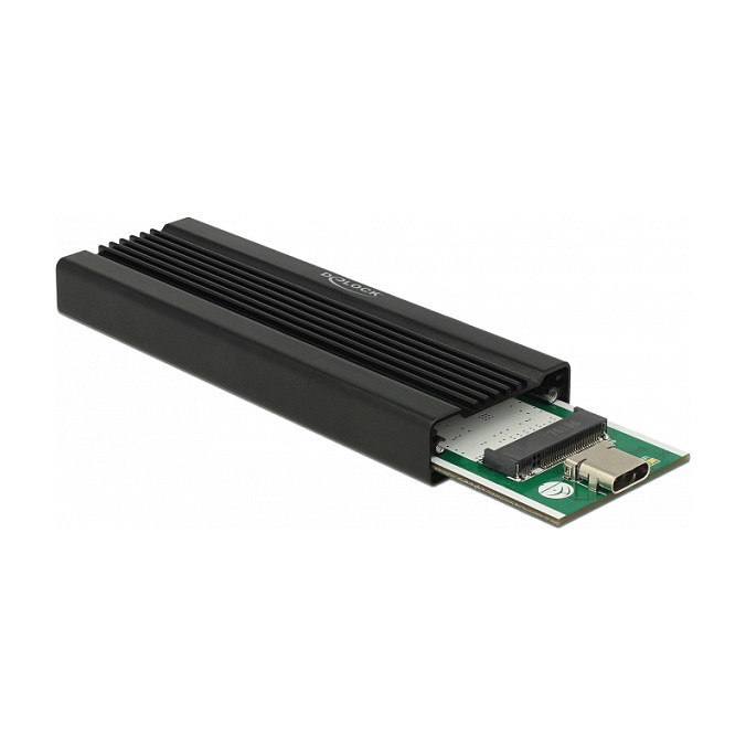 "DeLOCK 42600. Host interface: M.2, Output interface: USB 3.2 Gen 1 (3.1 Gen 1). Product colour: Black, LED indicators: Activity, Power. Chipset: JMicron JMS583, Data transfer rate (max): 10 Gbit/s. Windows operating systems supported: Windows 10, Windows 7, Windows 7 x64, Windows 8, Windows 8 x64, Windows 8.1, Windows 8.1 x64, Mac operating systems supported: Mac OS X 10.13 High Sierra, Other operating systems supported: ChromeOS. Width: 34 mm, Depth: 102 mm, Height: 12 mm"\n"This enclosure by Delock enables the installation of an M.2 PCIe NVMe SSD in 2280, 2260, 2242 and 2230 format, it can be connected via USB to the PC or laptop. The robust metal housing with cooling fins on the top ensures an optimum temperature of the memory."