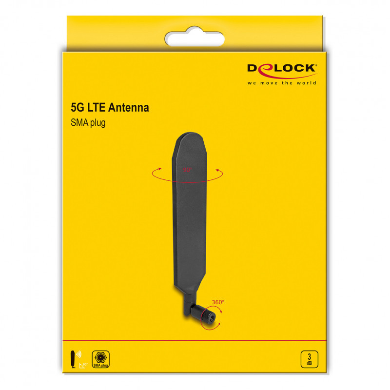 "DeLOCK 5G LTE Antenna SMA plug 3 dBi omnidirectional rotatable with tilt joint black. Antenna gain level (max): 3 dBi, Frequency band: 0.7 - 0.96 / 1.71 - 2.7 / 2.3 - 2.5 / 3.3 - 4 GHz, Gain: 0.5 / 3 dBi. Antenna type: Omni-directional antenna, Antenna connector type: SMA, Polarization: Dual polarization. Width: 42 mm, Depth: 209 mm, Height: 6 mm. Package type: Box. Quantity per pack: 1 pc(s)"\n"This 5G LTE antenna by Delock allows the usage of different 5G LTE bands inside. It is completely compatible to GSM, UMTS, LTE, ZigBee, Z-Wave, NB-IoT, WLAN 2.4 GHz, Bluetooth, ISM and LoRa.