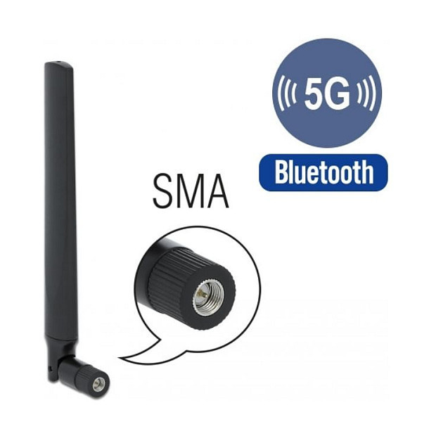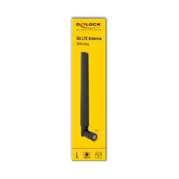 "DeLOCK 12634. Antenna gain level (max): 1.3 dBi, Impedance: 50 Ω. Antenna type: Omni-directional antenna, Antenna connector type: SMA, Connector gender: Male. Width: 21.5 mm, Depth: 13.5 mm, Height: 183.9 mm. Package type: Box. Quantity per pack: 1 pc(s)"\n"This 5G LTE antenna by Delock allows the usage of different 5G LTE bands inside. It is completely compatible to GSM, UMTS, 5G LTE, ZigBee, Z-Wave, NB-IoT, WLAN 2.4 GHz, Bluetooth, ISM, DECT and LoRa.