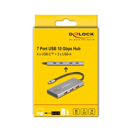 "DeLOCK 64313. Host interface: USB 3.2 Gen 2 (3.1 Gen 2) Type-C, Hub interfaces: USB 3.2 Gen 2 (3.1 Gen 2) Type-A, USB 3.2 Gen 2 (3.1 Gen 2) Type-C. Data transfer rate: 10000 Mbit/s, Product colour: Grey, Housing material: Aluminium. Power supply type: USB. Windows operating systems supported: Windows 10, Windows 10 x64, Windows 11, Mac operating systems supported: Mac OS X 12.0 Monterey, Mac OS X 13.0 Ventura, Mac OS X 14.0 Sonoma, Mac OS X 15.0 Sequoia, Linux operating systems supported: Linux Kernel 6.2, Linux Kernel 6.5. Width: 44 mm, Depth: 117 mm, Height: 9 mm"\n"The USB hub by Delock can be connected via USB Type-C™ interface to a PC or laptop. It has three USB Type-A connectors as well as four USB Type-C™ connectors. Different USB devices such as USB flash memory, card reader, external enclosure etc. can be connected.