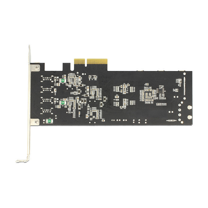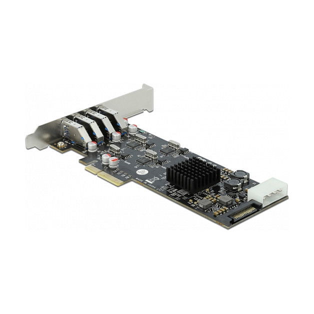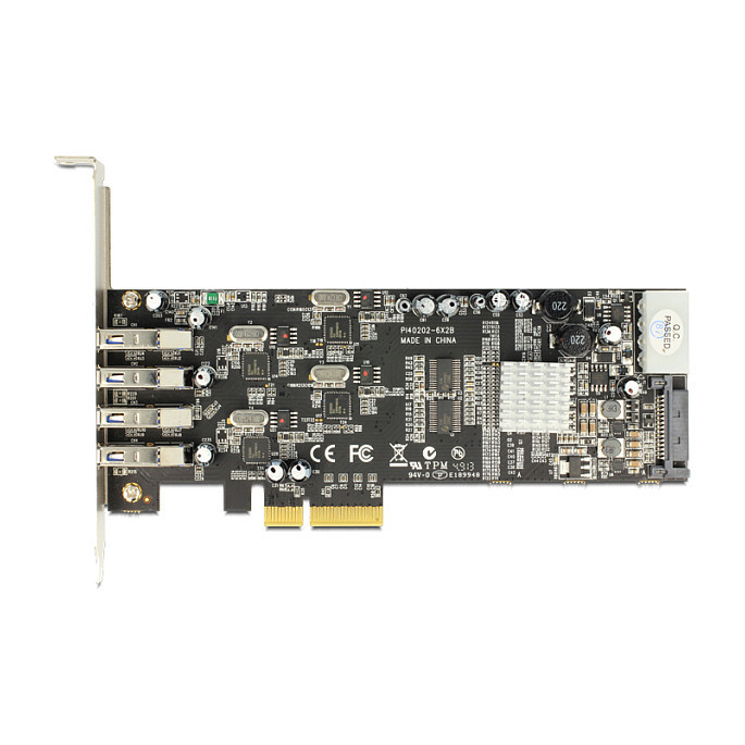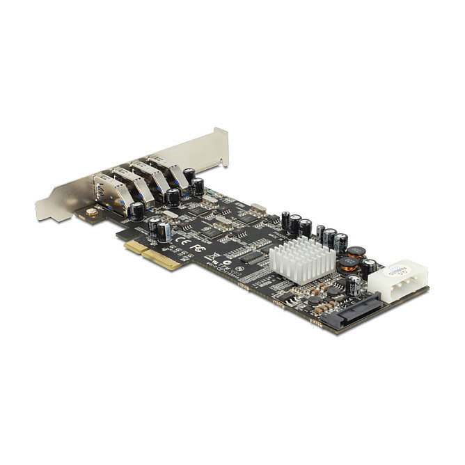 "DeLOCK 89365. Host interface: PCIe, Output interface: USB 3.2 Gen 1 (3.1 Gen 1). Certification: Windows XP/XP-64/Vista/Vista-64/7/7-64/8, Linux. Data transfer rate (max): 5 Gbit/s. Windows operating systems supported: Windows 7 Home Basic, Windows 7 Home Basic x64, Windows 7 Home Premium, Windows 7 Home Premium..."\n"The Delock PCI Express card expands your PC by four external USB 3.0 ports. Each port is supported by a single NEC chip, which provides a high data transfer rate. You can connect USB devices like e.g. docking station, card reader, external enclosure etc. to the card. Due to the vertical direction of the USB 3.0 ports you can also install the card into a low profile slot."