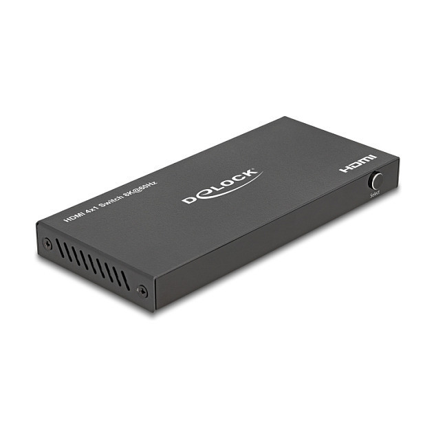 "DeLOCK HDMI Switch 4 x HDMI in to 1 x HDMI out 8K 60 Hz. Video port type: HDMI. Material: Metal, Product colour: Black, Maximum refresh rate: 144 Hz. Power consumption (max): 5 W. Width: 61 mm, Depth: 136 mm, Height: 14 mm. Quantity per pack: 1 pc(s), Cables included: USB"\n"With this HDMI switch by Delock up to four HDMI devices can be used with one HDMI monitor, TV or projector. The button on the device or the remote control can be used to switch between the HDMI devices.