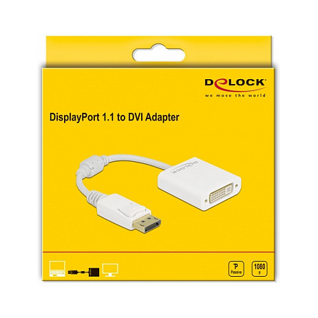 "DeLOCK Adapter DisplayPort 1.1 male to DVI female Passive white. Cable length: 0.15 m, Connector 1: DisplayPort, Connector 2: DVI-D"\n"This adapter by Delock enables the connection of a DVI monitor to the system via a free DisplayPort interface."