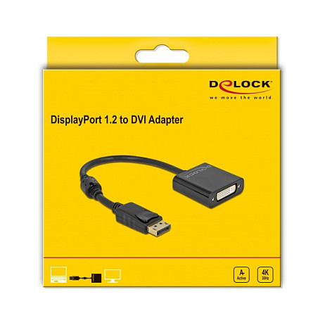 "DeLOCK Adapter DisplayPort 1.2 male to DVI female 4K Active black. Cable length: 0.2 m, Connector 1: DisplayPort, Connector 2: DVI"\n"This adapter by Delock enables the connection of an DVI monitor to the system via a free DisplayPort interface. The adapter supports a resolution up to 4K Ultra HD at 30 Hz and is backward compatible to Full-HD 1080p. The adapter offers an active conversion, thus it is also suitable for graphics cards that are not capable of outputting DP++ signals."