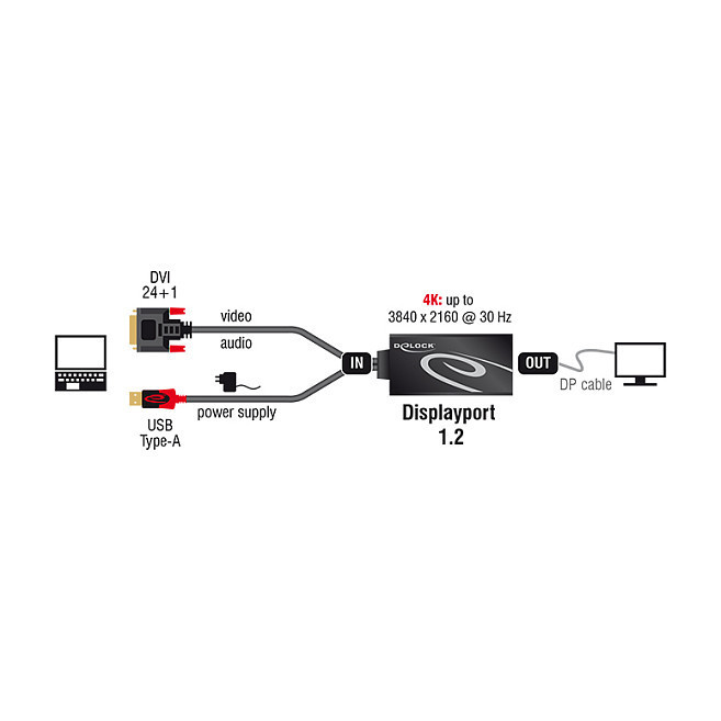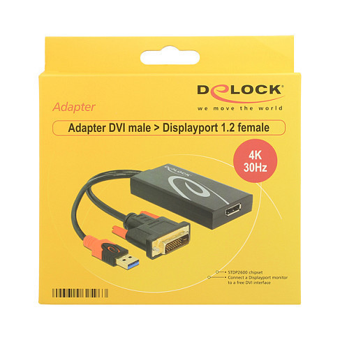 "DeLOCK 0.3m, DVI 24+1 + USB-A/Displayport 20p. Cable length: 0.3 m, Connector 1: DVI-D + USB, Connector 2: HDMI. Package type: Polybag"\n"This adapter by Delock can be used to connect e.g. a Displayport monitor to a free DVI interface of the system."