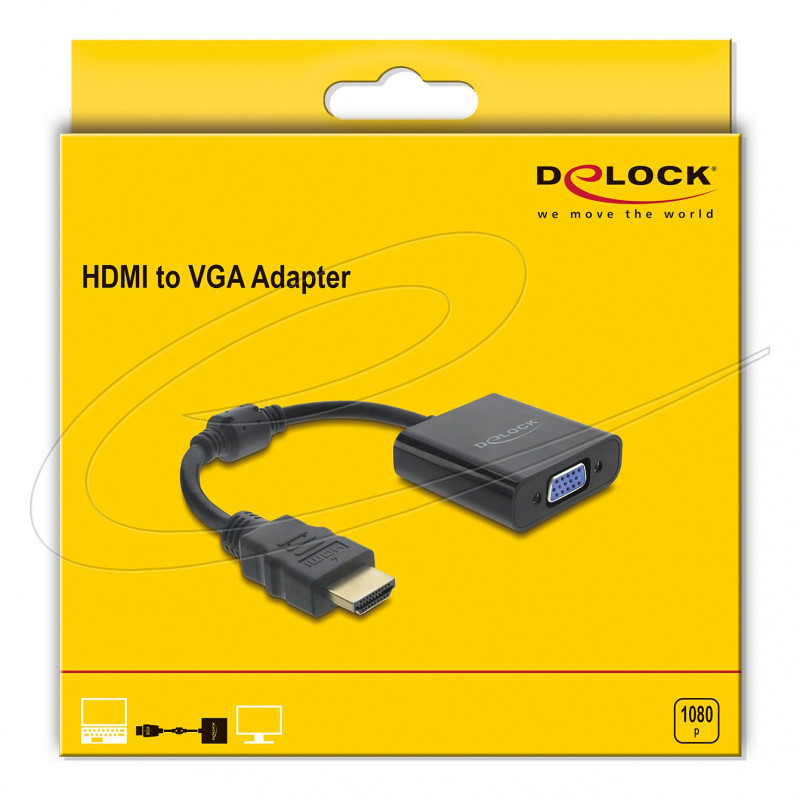 "DeLOCK 61077. Cable length: 0.15 m, Connector 1: HDMI Type A (Standard), Connector 2: VGA (D-Sub). Package type: Hanging box. Quantity per pack: 1 pc(s)"\n"This adapter by Delock can be used to connect e.g. a VGA monitor to a free HDMI interface of the system."