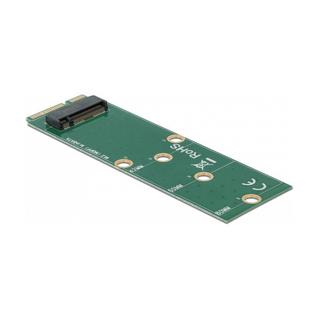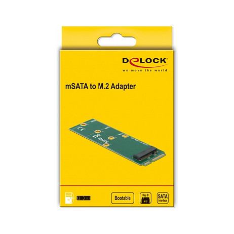 "DeLOCK Adapter mSATA to M.2 Key B slot. Host interface: mSATA, Output interface: M.2. Purpose: PC. Width: 30 mm, Depth: 95 mm, Height: 4 mm"\n"This adapter by Delock enables the connection of an M.2 SSD in 2280, 2260 and 2242 format. The adapter can be installed into the system through an mSATA interface."