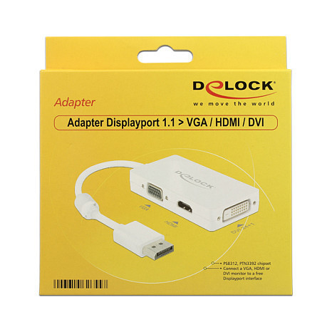 "DeLOCK 0.16m DisplayPort/VGA+HDMI+DVI-D. Cable length: 0.16 m, Connector 1: DisplayPort, Connector 2: VGA (D-Sub)+ HDMI + DVI. Package type: Box. Quantity per pack: 1 pc(s)"\n"This Displayport adapter by Delock enables you to extend your system by one VGA, HDMI and DVI interface. Thus you can connect different devices like e.g. TV, beamer, PC monitor etc. Only one monitor can be used on the adapter, not several at the same time."