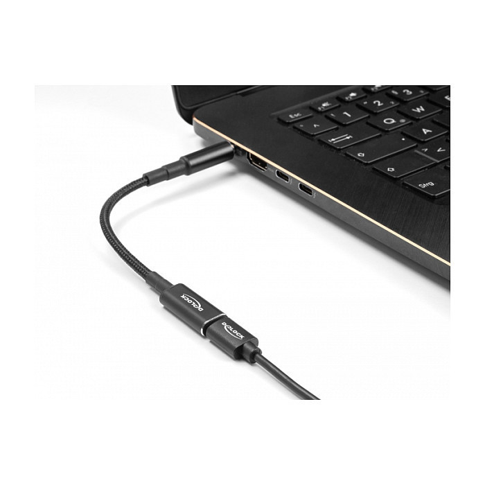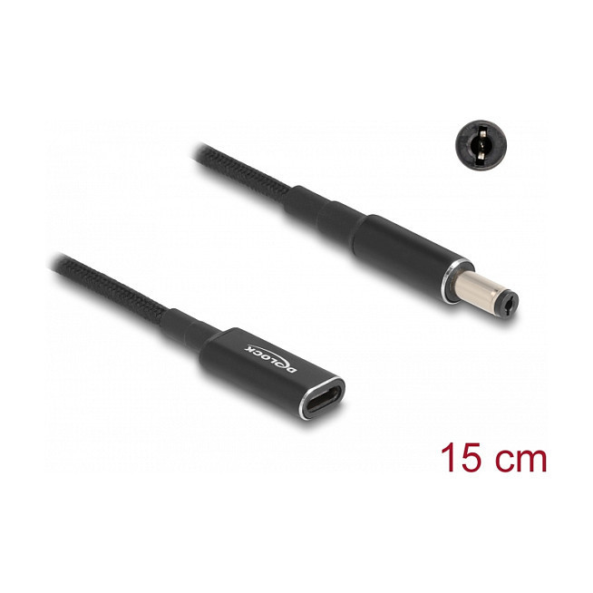 "DeLOCK Adapter cable for Laptop Charging Cable USB Type-C female to 5.5 x 2.1 mm male 15 cm. Connector 1: USB Type-C, Connector 2: PD, Cable length: 0.15 m. Product colour: Black"\n"With this adapter cable by Delock a USB Type-C™ cable can be used to charge a laptop.