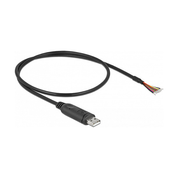 "DeLOCK Adapter cable USB 2.0 Type-A to Serial RS-232 with 9 open wires + Shielding 0.5 m. Product colour: Black, Cable length: 0.5 m, Connector 1: USB 2.0. Quantity per pack: 1 pc(s)"\n"This USB 2.0 Type-A to serial RS-232 adapter cable by Delock is suitable as a connection cable between a device with USB 2.0 and a device with RS-232 port. Due to the tinned open cable ends, the connection can be made directly to the RS-232 device connector or flexible to various terminal blocks. In addition, it can be used to produce individual adapters and cable assemblies."
