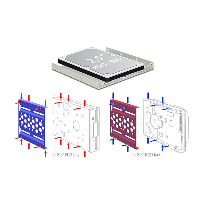 "DeLOCK 21287. Size (imperial): 8.89 cm (3.5""), Type: Carrier panel, Product colour: Black. Width: 98 mm, Depth: 101.8 mm, Height: 9.8 mm"\n"With this aluminium installation frame by Delock a 2.5″ drive, such as an SSD or HDD, can be mounted in a 3.5″ drive bay of a PC. The extensive installation options allow a secure attachment of the frame. The honeycomb design and the optional fans ensure cooling when using fast drives."