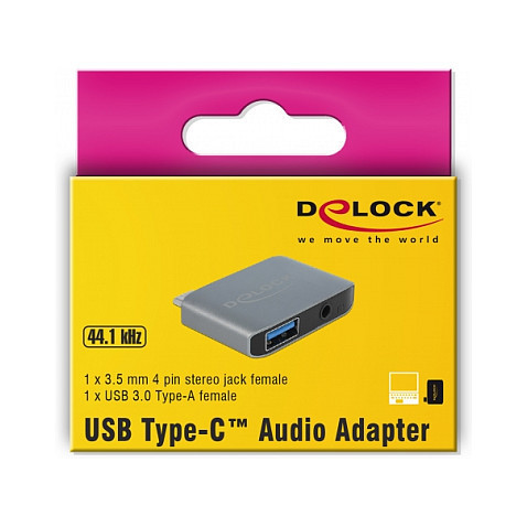 "DeLOCK 63965. Product colour: Anthracite, Housing material: Aluminium, Country of origin: China. Width: 30 mm, Depth: 45 mm, Height: 9 mm. Compatible operating systems: Android 6.0, Chrome OS, Linux Kernel 3.17, Mac OS 10.9, Windows 7/7-64/8.1/8.1-64/10/10-64, Chipset: Cmedia HS-100B"\n"This audio adapter by Delock allows the connection of headphones, a headset or loudspeakers with a stereo jack to a device with a USB Type-C connector, such as a Smartphone, MacBook or Chromebook. The USB 3.0 port can be used for USB flash drives or card readers."