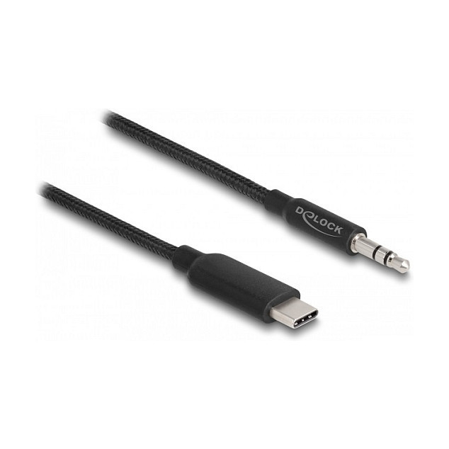 "DeLOCK Audio Stereo Cable USB Type-C male to Stereo plug 3.5 mm 3 pin 1 m black. Connector 1: 3.5mm, Connector 1 gender: Male, Connector 2: USB Type-C, Connector 2 gender: Male, AWG wire size: 26, Cable length: 1 m, Product colour: Black"\n"This audio cable by Delock enables the connection of a laptop, tablet or mobile phone with USB Type-C™ interface to an audio output device, e.g. speaker or car radio with 3.5 mm stereo jack. Due to its length of 1 m it’s a suitable companion for on the go or during travel and usable at any time. Optically it convinces with its fine textile shielding."