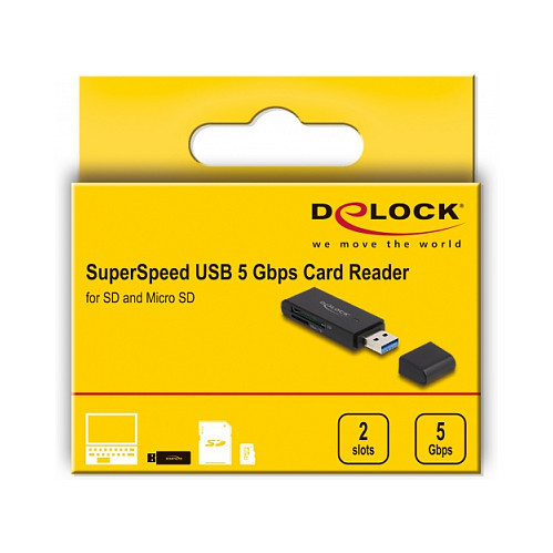 "DeLOCK Card Reader SuperSpeed USB 5 Gbps for SD and Micro SD memory cards. Compatible memory cards: MicroSD (TransFlash), SD, SDHC, SDXC, Product colour: Black, Data transfer rate: 5000 Mbit/s. Interface: USB. Width: 21 mm, Depth: 70 mm, Height: 9 mm. Quantity per pack: 1 pc(s), Package type: Box"\n"This card reader by Delock has two memory card slots and allows to read and write different SD, MMC and Micro SD memory cards. The card reader can be connected to a PC or laptop via the USB Type-A interface.