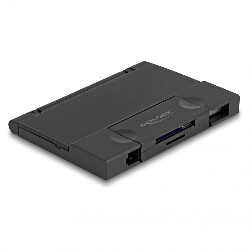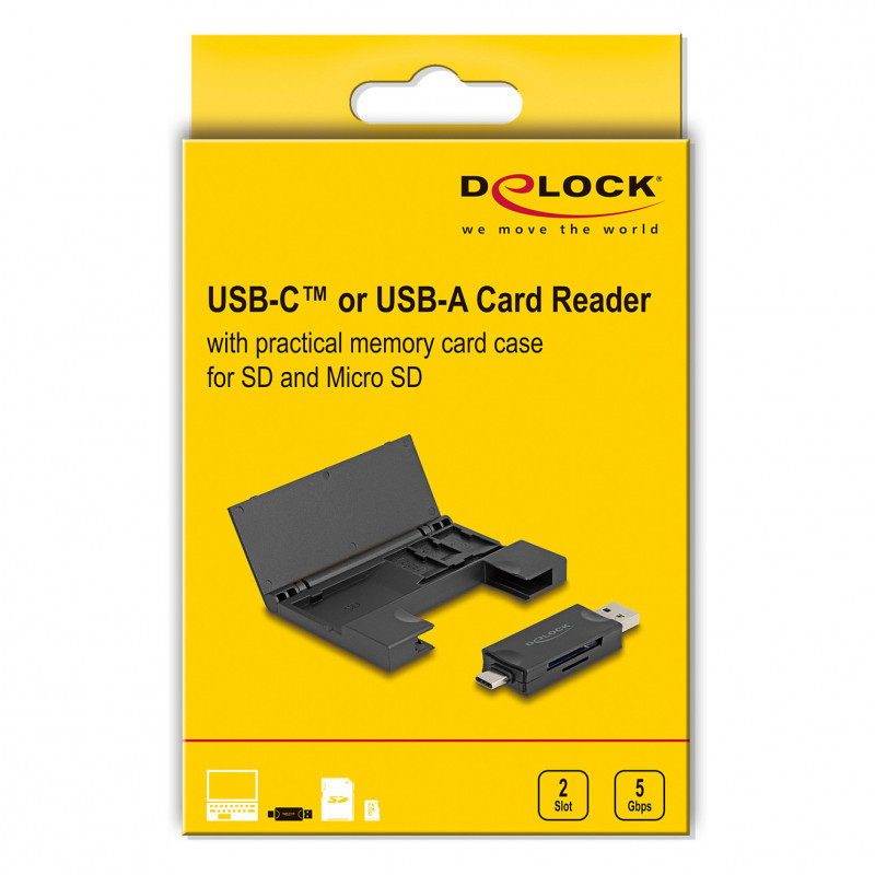 "DeLOCK 91014. Compatible memory cards: MMC, MicroSD (TransFlash), SD, Product colour: Black, Data transfer rate: 5000 Mbit/s. Interface: USB 3.2 Gen 1 (3.1 Gen 1) Type-A/Type-C. Width: 60 mm, Depth: 85 mm, Height: 10 mm. Quantity per pack: 1 pc(s), Package type: Hanging box. Windows operating systems supported: Windows 10, Windows 11, Mac operating systems supported: Mac OS X 14.0 Sonoma, Linux operating systems supported: Linux Kernel 6.2, Linux Kernel 6.5"\n"This card reader by Delock has two memory card slots and allows to read and write different SD, MMC and Micro SD memory cards. The card reader can be connected to a PC or a mobile device via the USB Type-C™ or the USB Type-A interface.