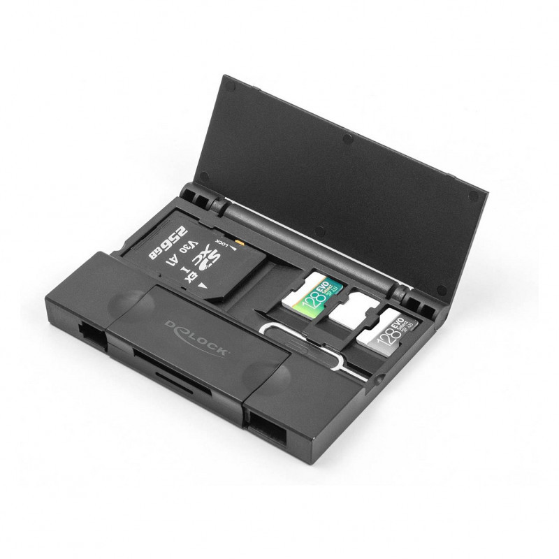 The handy box is suitable for storing and transporting memory cards. The cards are protected from damage and remain free from dirt and dust. A total of two Micro SD, one Nano Sim as well as one SD card can be stored. The box also has space for a SIM card needle."