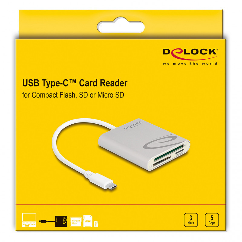 "DeLOCK Card Reader USB Type-C for Compact Flash, SD or Micro SD memory cards. Compatible memory cards: CF, MMC, MMCmicro, MicroSD (TransFlash), MicroSDHC, MicroSDXC, MiniSD, RS-MMC, SD, SDXC, Product colour: Grey, Data transfer rate: 5000 Mbit/s. Interface: USB 3.2 Gen 1 (3.1 Gen 1) Type-C. Width: 64 mm, Depth: 69 mm, Height: 14 mm. Quantity per pack: 1 pc(s), Package type: Hanging box. Compatible operating systems: Android 10.0 or above, Chrome OS, Linux Kernel 5.11 or above, Mac OS 11.2.3 or above, Windows..."\n"Description