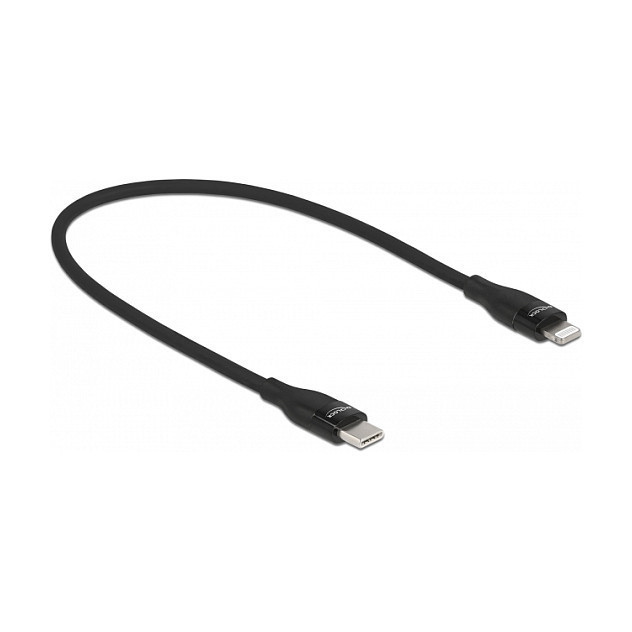 "DeLOCK Data and charging cable USB Type-C™ to Lightning™ for iPhone™, iPad™ and iPod™ black 0.5 m MFi. Cable length: 0.5 m, Connector 1: USB C, Connector 2: USB C/Lightning. Output voltage: 9 V, Output current (max): 3 A. Cable diameter: 3.7 mm. Quantity per pack: 1 pc(s), Package type: Box"\n"Description