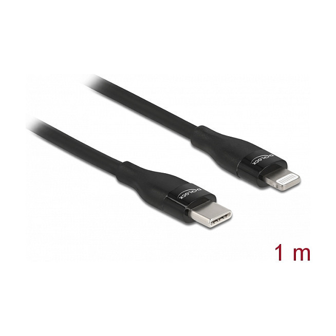 "DeLOCK Data and charging cable USB Type-C to Lightning for iPhone, iPad and iPod black 1 m MFi. Cable length: 1 m, Connector 1: Lightning, Connector 2: USB C. Output voltage: 9 V, Output current (max): 3 A. Cable diameter: 3.7 mm. Quantity per pack: 1 pc(s)"\n"This USB data and charging cable by Delock can be used to connect an iPhone™, iPad™ or iPod™ to a computer or laptop with USB Type-C™ or Thunderbolt™ 3 port, e.g. to a MacBook. The device is charged and data can be transferred.