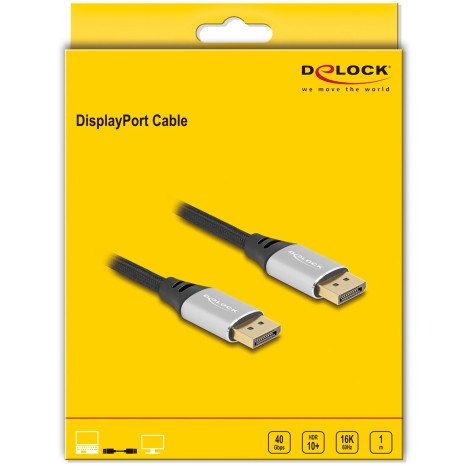 "DeLOCK DisplayPort Cable 16K 60 Hz 1 m silver metal. Cable length: 1 m, Connector 1: DisplayPort, Connector 2: DisplayPort. Cable diameter: 6 mm. Package type: Hanging box. Quantity per pack: 1 pc(s). Country of origin: China"\n"This cable by Delock is used to connect devices with a DisplayPort interface, such as monitors or TVs, to a PC or a laptop.