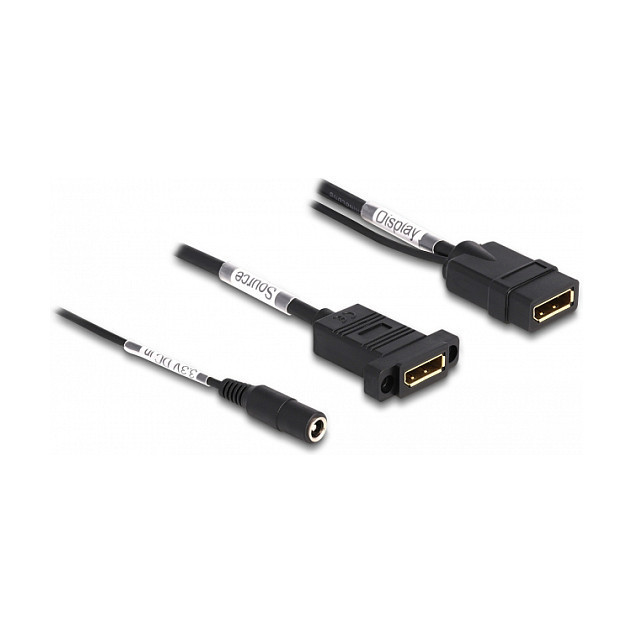 "DeLOCK DisplayPort Cable 4K 60 Hz with DC feed 2.1 x 5.5 mm 0.30 m panel-mount. Connector 1: DisplayPort, Connector 2: DisplayPort, DC, Cable length: 0.3 m. Product colour: Black"\n"This DisplayPort cable by Delock is designed to provide a DisplayPort female port. Via the additional DC connector, it is possible to feed in power. By using active adapters, a constant power supply can be guaranteed."