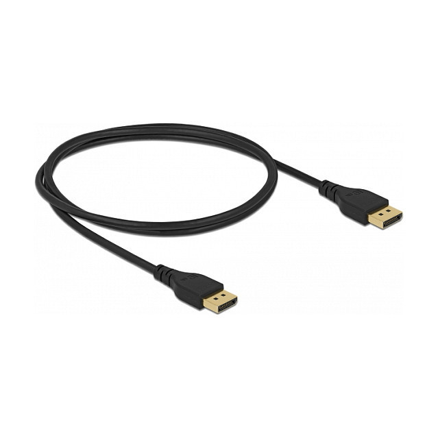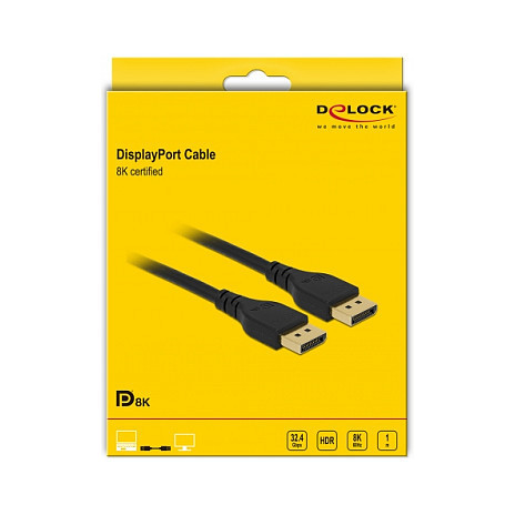 "DeLOCK DisplayPort cable 8K 60 Hz 1 m DP 8K certified without latch. Cable length: 1 m, Connector 1: DisplayPort, Connector 2: DisplayPort. Cable diameter: 7.5 mm"\n"This certified DisplayPort cable by Delock is used to connect devices with a DisplayPort interface, such as monitors, projectors or televisions, to a PC or laptop. By supporting a maximum bandwidth of 32.4 Gbps, content up to 8K Ultra HD (7680 x 4320 @ 60 Hz) resolution can be displayed. The high-quality, triple-shielded cable also significantly improves the quality of audio transmissions with a sampling rate of up to 1536 kHz.