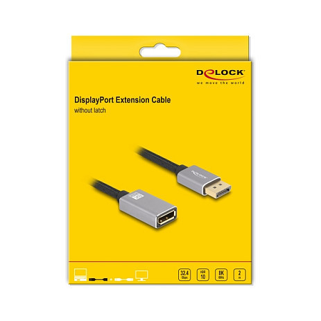 "DeLOCK DisplayPort extension cable 8K 60 Hz 2 m grey metal without latch. Cable length: 2 m, Connector 1: DisplayPort, Connector 2: DisplayPort. Cable diameter: 6 mm. Package type: Hanging box. Country of origin: China"\n"This DisplayPort cable by Delock enables the extension of a DisplayPort connection.