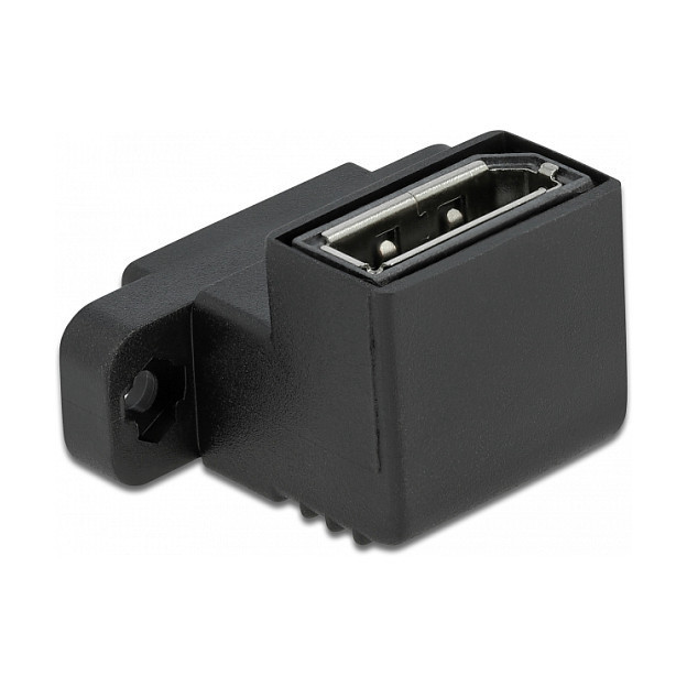 "DeLOCK Easy 45 DisplayPort Adapter angled 90°. Connector 1: DisplayPort, Connector 2: DisplayPort. Product colour: Black"\n"This Easy 45 adapter by Delock is designed to connect two DisplayPort cables. The adapter can be used to extend cables or as a gender changer. The two holes on the side allow the adapter to be screwed into devices or furniture, for example.