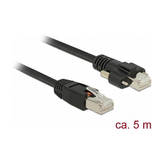 "DeLOCK 85670. Cable length: 5 m, Cable standard: Cat6, Cable shielding: S/FTP (S-STP), Connector 1: RJ-45, Connector 2: RJ-45, Product colour: Black"\n"This network cable by Delock can be used to connect different networking devices, e.g. a NIC to a switch or a patch panel. The screws of the connector secure the connection and prevent accidental unplugging of the cable."