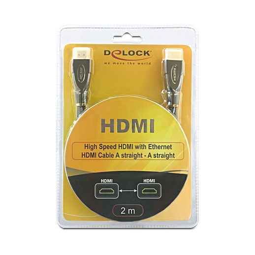 "DeLOCK 2m HDMI AM/AM. Cable length: 2 m, Connector 1: HDMI Type A (Standard), Connector 2: HDMI Type A (Standard), Connector contacts plating: Gold, Data transfer rate: 10.2 Gbit/s, Product colour: Black"\n"This high quality High Speed HDMI with Ethernet cable by Delock complies with the latest HDMI standard and combines fast data transfer as well as audio-/video- and Ethernet connection. Thus you can connect e.g. your PC or DVD/Blu-ray drive to a monitor or TV. The HDMI-A interface is downwards compatible to its forerunners and enables you to use your existing devices. It convinces with its classy metal housing and goldplated connector as well as with its net shielding and twisted-pair cabling."