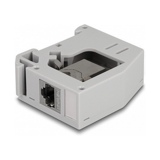 "DeLOCK DIN rail Adapter with Keystone Module RJ45 jack to RJ45 jack Cat.6A. Construction type: Flat, Product colour: Grey, Connector 1: RJ-45. Width: 60.5 mm, Depth: 56.3 mm, Height: 21.6 mm. Quantity per pack: 1 pc(s)"\n"This adapter by Delock contains a matching keystone module with an RJ45 jack that can be used to connect a network cable. At the same time, the adapter can be attached to a 35 mm wide DIN rail to enable e.g. the installation in a network cabinet. The adapter also has a small labelling field which can be individually labelled or provided with various symbols."