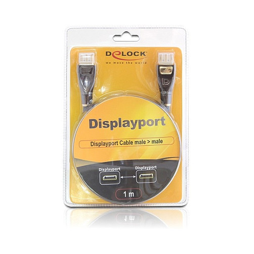 "DeLOCK 82770. Cable length: 1 m, Connector 1: DisplayPort, Connector 2: DisplayPort"\n"This high quality Displayport cable enables you to connect Displayport devices e.g. displays or TV to your PC. The Displayport is a standardized universal connecting standard by VESA for the transfer of video and audio signal. It convinces with its classy metal housing and gold-plated connector as well as with its net shielding and twisted-pair cabling."