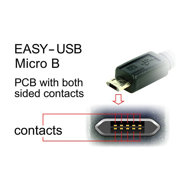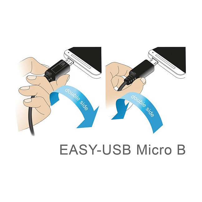 "DeLOCK 83851. Cable length: 3 m. Connector 1: USB A, Connector 2: Micro-USB B, USB version: USB 2.0, Connector gender: Male/Male, Connector contacts plating: Gold, Product colour: Black"\n"This cable by Delock with EASY-USB A male and EASY-Micro USB male can be plugged into the appropriated USB female port in both directions. Thus the male connector can be used both-sided which makes the plug in easier."
